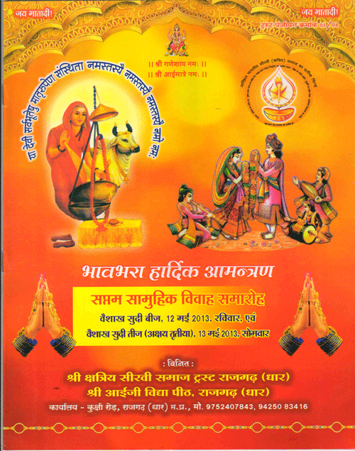 राजगढ़ (धार) निप्र क्षत्रिय सीरवी समाज ट्रस्ट राजगढ़ द्वारा आयोजित सप्तम सामूहिक विवाह दिनांक 13 मई 2013 आखातीज को आईजी विद्या पीठ परिसर राजगढ़ मे होगा । समारोह मे 37 जोड़ो का परिणय सस्ंकार सपन्न होगा। समारोह के मुख्य अतिथि श्री कप्तानसिंहजी सोलंकी राज्य सभा सांसद,एवं श्री महेन्द्रजी हार्डिया प्रभारी मंत्री धार जिला ,अध्यक्षता श्री प्रेम प्रकाषजी चैधरी राष्ट्रीय अध्यक्ष अखिल भारतीय सीरवी महासभा (सीनियर एडव्होकेट सुप्रिम कोर्ट नई दिल्ली विषेष अतिथि श्री गजेन्द्रसिंह जी राजुखेड़ी सांसद धार- महु क्षेत्र, श्री राजवर्द्धनसिंहजी दत्तिगाॅव विधायक बदनावर ,श्री प्रतापजी ग्रेवाल विधायक सरदारपुर, श्री सुरेषजी तातेड, पूर्व अध्यक्ष नगर पंचायत राजगढ़ एवं श्री मोहनजी भायल उपाध्यक्ष जिला सहकारी केन्द्रीय बैंक धार, नौ प्रान्तो के अखिल भारतीय सीरवी महासभा के प्रान्तीय अध्यक्ष , सात परगना (क्षेत्र) के अध्यक्ष एवं अखिल भारतीय सीरवी महासभा के राष्ट्रीय पदाधिकारी , प्रान्तीय पदाधिकारी ,परगना जिला पदाधिकारी एवं समाज के भामाषाह (समाजसेवी) उपस्थित रहेगे ।