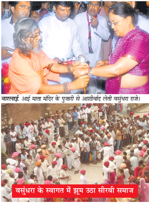 राजस्थान की पूर्व मुख्यमन्त्री श्रीमती वसुन्धरा राजे दिनांक 27.07.2013 को सुबह 9 बजे आई माताजी के दर्शन करने के लिए नारलाई स्थित जैकलजी मन्दिर पधारने पर सीरवी समाज द्वारा जोरदार स्वागत किया गया जिसमे सीरवी समाज के अखिल भारतीय सीरवी समाज के अध्यक्ष पी पी चौधरी, युवा नेता सुनील चोयल व् अन्य लोग मोजूद थे.दिलीप कुमार सीरवी