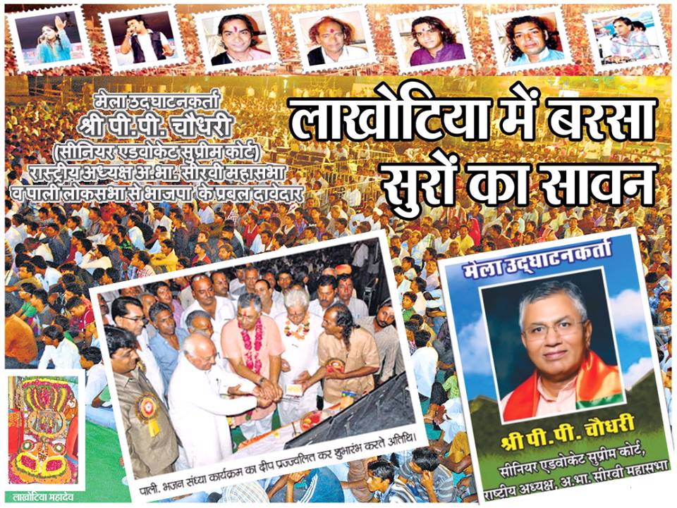 समाजसेवी, सीनियर एडवोकेट(सुप्रीम कोर्ट) और पाली लोकसभा से भाजपा की उम्मीदवारी से प्रबल दावेदार अखिल भारतीय सीरवी महासभा के रास्ट्रीय अध्यक्ष पीपी चौधरी ने भजन संध्या का और मेले का दीप प्रजलित कर शुभारम किया।