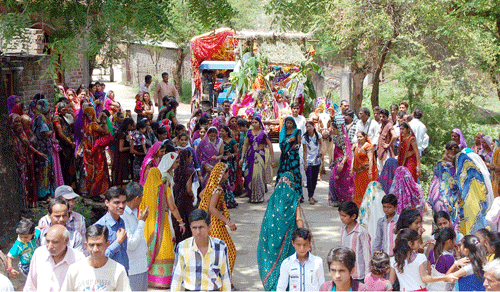 फोटो07एमएनआर03 जाजमखेड़ी में बैलगाड़ी में आई माता का जुलूस निकालते श्रद्धालु।
