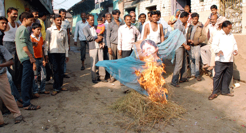 मनावर। सुनील अगल्चा हत्याकांड का अब तक खुलासा नहीं होने तथा रंजना बघेल को पुन: मनावर से भाजपा का उम्मीदवार बनाए जाने से ग्राम कुराड़ाखाल में सिर्वी समाज के आक्रोशित युवाओं द्वारा सोमवार को सुबह रंजना बघेल का पुतला जलाया गया।