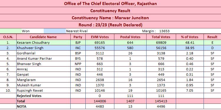 मारवाड़ जंक्शन विधान सभा से चुनाव जीते एक मात्र सीरवी श्री केसारामजी को समाज के कही पदाधिकारियो ने बधाई सन्देश भेजना शुरु कर दिया है सीरवी समाज डॉट कॉम के पास कही महानुभावो ने फोन करके बधाई दी है अखिल भारतीय सीरवी समाज के राष्ट्रीय अध्यक्ष व पुरी कार्यकारिणी ने बधाई सन्देश भेजा है जयपुर से श्री मदनसिंहजी , पुना से चन्दारामजी , बंगलोर से हेमन्तजी , हैदराबाद से जस्सारामजी आदि बहूत से सज्जनों ने शुभकामनाएं भेजी है