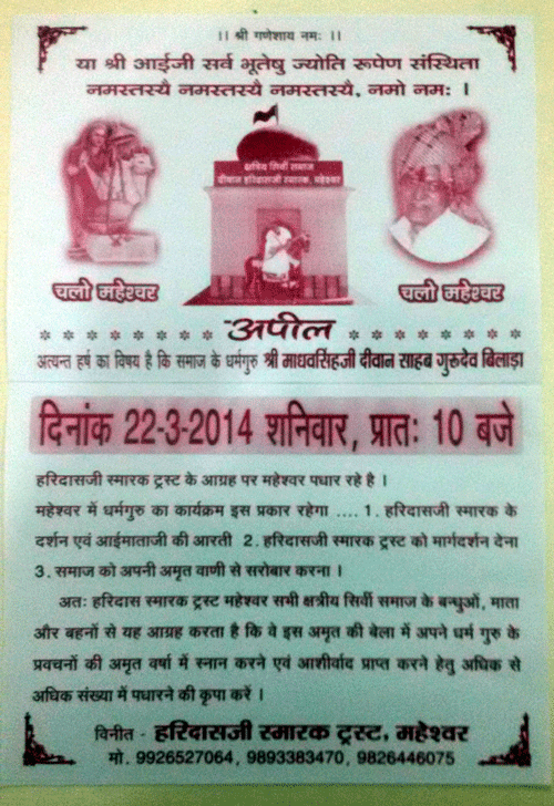 JAI MATA JI RI SHA SABHI SAMAJ BANDHUO KO 22 MARCH SANIVAR KO MAHESWAR PADHARANA HAI US ROJ SHREE DIWAN MADHAV SINGH JI SABHA KO SAMBODHIT KAREGE.