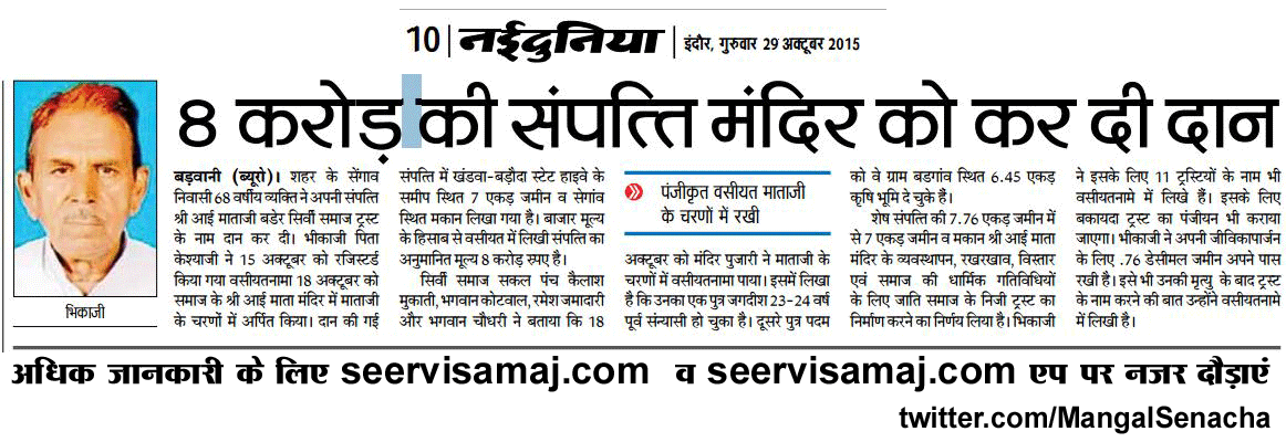 मध्यप्रदेश के बड़वानी के सेंगाव निवासी सीरवी श्री भीकाजी सुपुत्र श्री कैसाजी ने 8 करोड़ की संपत्ति श्री आई माताजी मंदिर के नाम कर दी ।