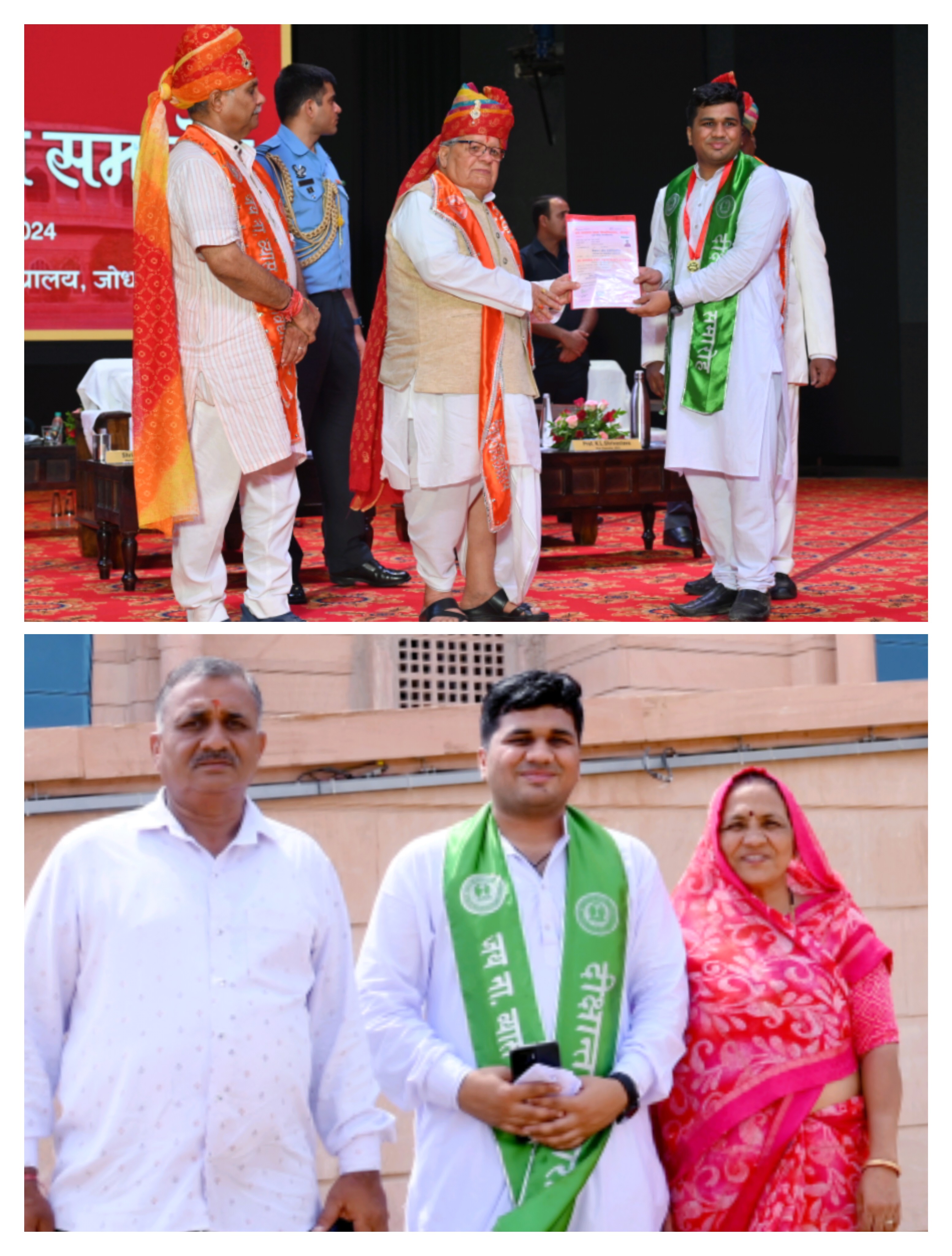 जोधपुर/सीरवी समाज की होनहार प्रतिभा राहुल सीरवी को हाल ही में हुए 21 जून 2024 को आयोजित 20 वा दीक्षांत समारोह जय नारायण व्यास विश्वविद्यालय जोधपुर में गोल्ड मेडल के साथ श्री कलराज मिश्र ( राजस्थान के राज्यपाल) द्वारा उपाधि प्रदान की गई।राहुल सीरवी ने जोधपुर की एम बी एम इंजीनियरिंग कॉलेज ,राजस्थान से बैचलर ऑफ इंजीनियरिंग इन प्रोडक्शन एंड इंडस्ट्रियल इंजीनियरिंग 2022 बैच (8.80/10 सी जी पी ए) की है